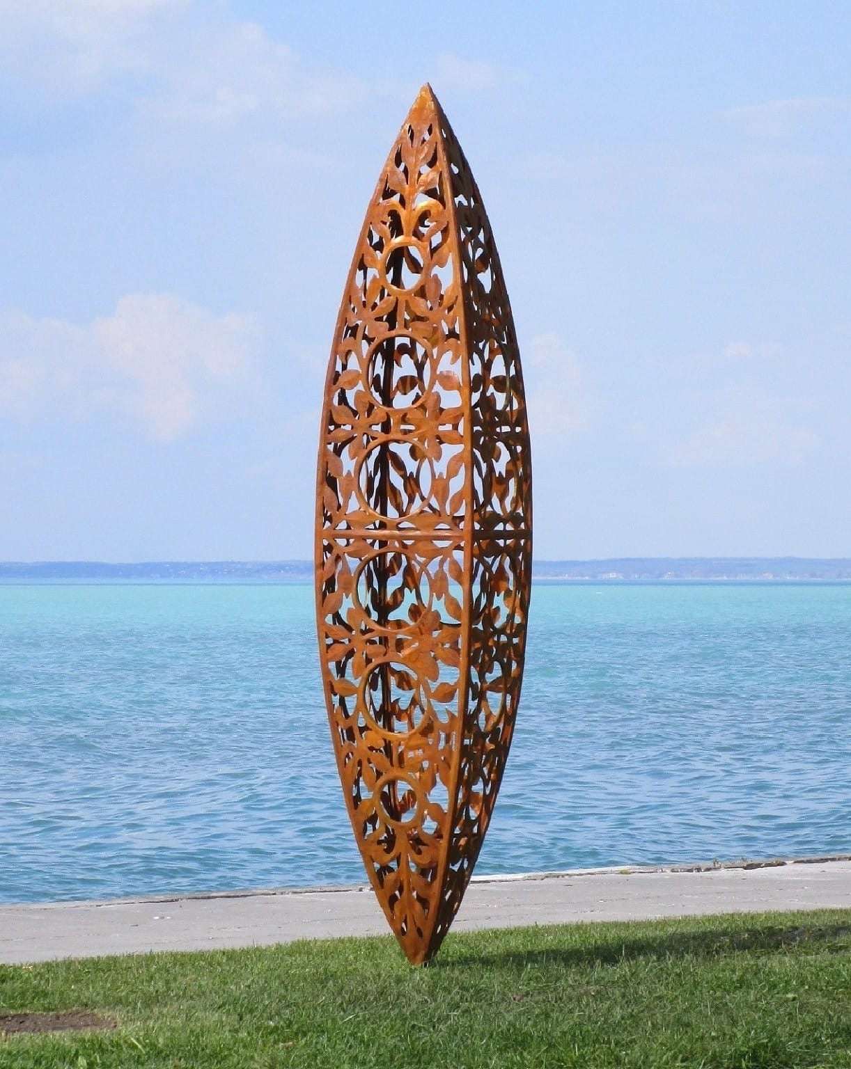 Die Skulptur zeigt eine schlanke, spitz zulaufende Form aus rostfarbenem Metall, die an ein stilisiertes Blatt oder ein Boot erinnert. Ihre Oberfläche ist mit filigranen, symmetrischen Mustern durchbrochen, die florale und geometrische Elemente kunstvoll miteinander verbinden. Die feine Durchlässigkeit der Struktur lässt Licht und Schatten spielerisch interagieren und verleiht der Skulptur Leichtigkeit trotz ihrer Größe.