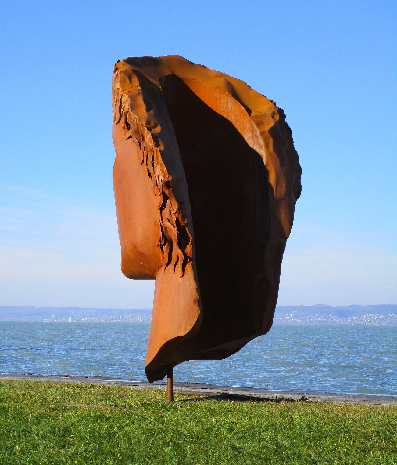 Die Skulptur zeigt einen großen, stilisierten menschlichen Kopf, gefertigt aus rostfarbenem Metall. Die Gesichtszüge sind schlicht und geometrisch geformt, mit einer markanten Nase, angedeuteten Augen und klar definierten Konturen. Die Haare sind durch fließende, minimalistische Linien dargestellt, die dem Kopf eine natürliche Textur verleihen. Der Halsbereich ist verlängert und verjüngt sich nach unten, wodurch die Skulptur eine moderne, abstrahierte Form erhält. Die matte, rostige Oberfläche des Materials verleiht der Skulptur einen industriellen und zugleich organischen Charakter.