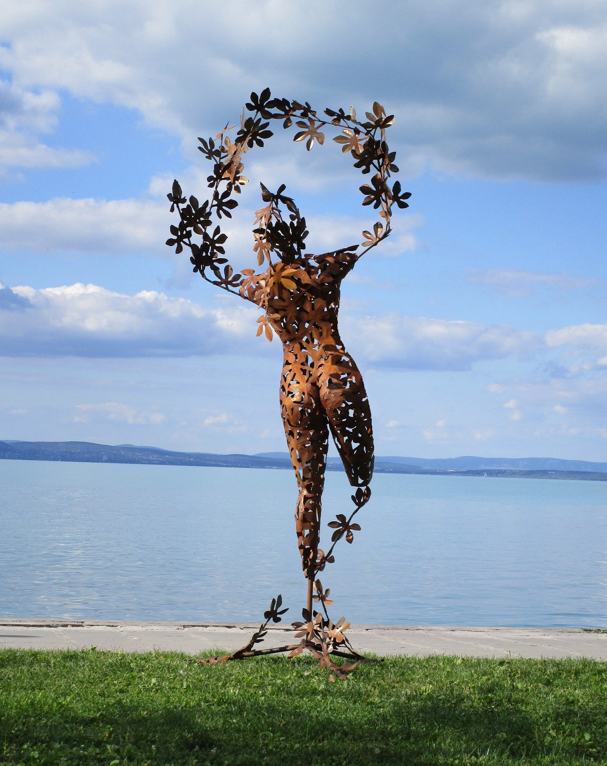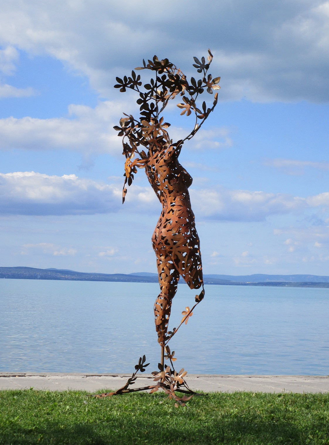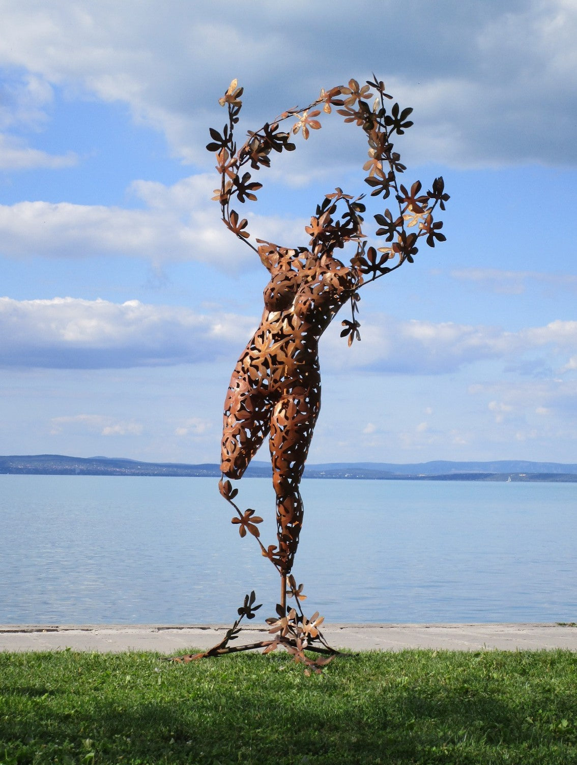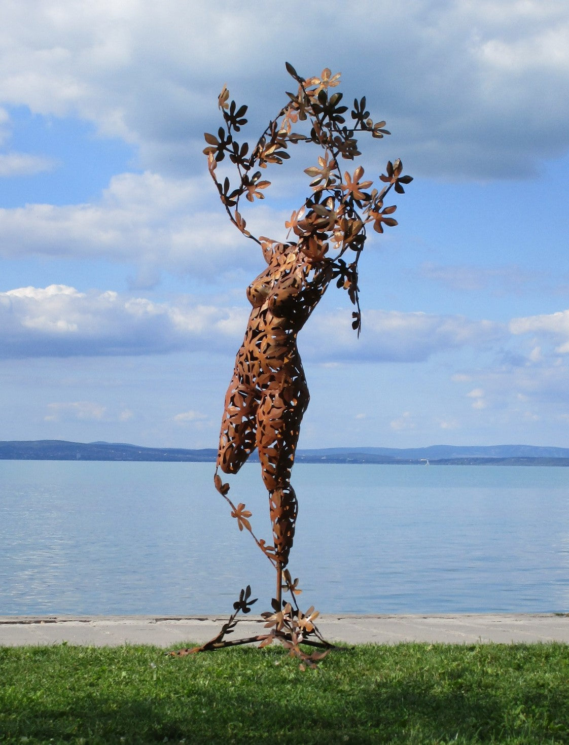 Die Skulptur zeigt eine stilisierte menschliche Figur, die aus filigranen, rostfarbenen Metallteilen besteht. Sie wirkt organisch und naturverbunden.