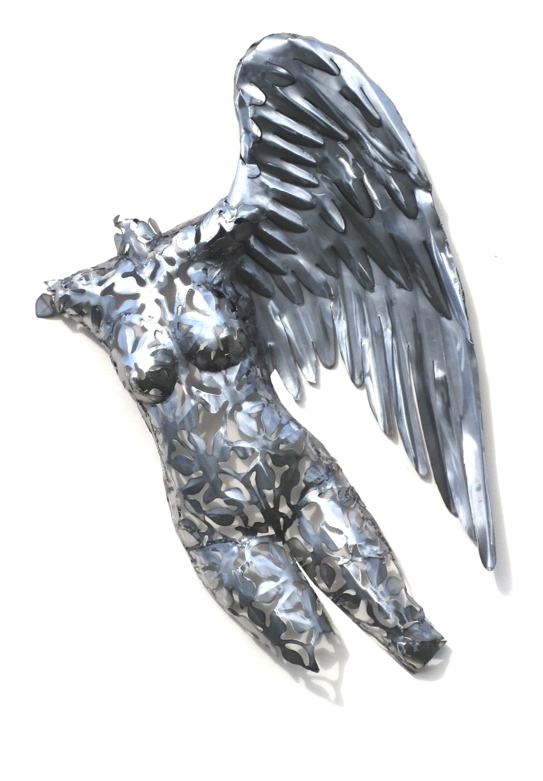 Die Skulptur stellt eine geflügelte Frauenfigur dar, die aus poliertem Metall gefertigt ist. Ihr Körper besteht aus zahlreichen filigranen, blattähnlichen Formen, die miteinander verschweißt sind, wodurch eine durchbrochene, luftige Struktur entsteht. Die Oberfläche reflektiert das Licht und betont die dynamische, organische Gestaltung.