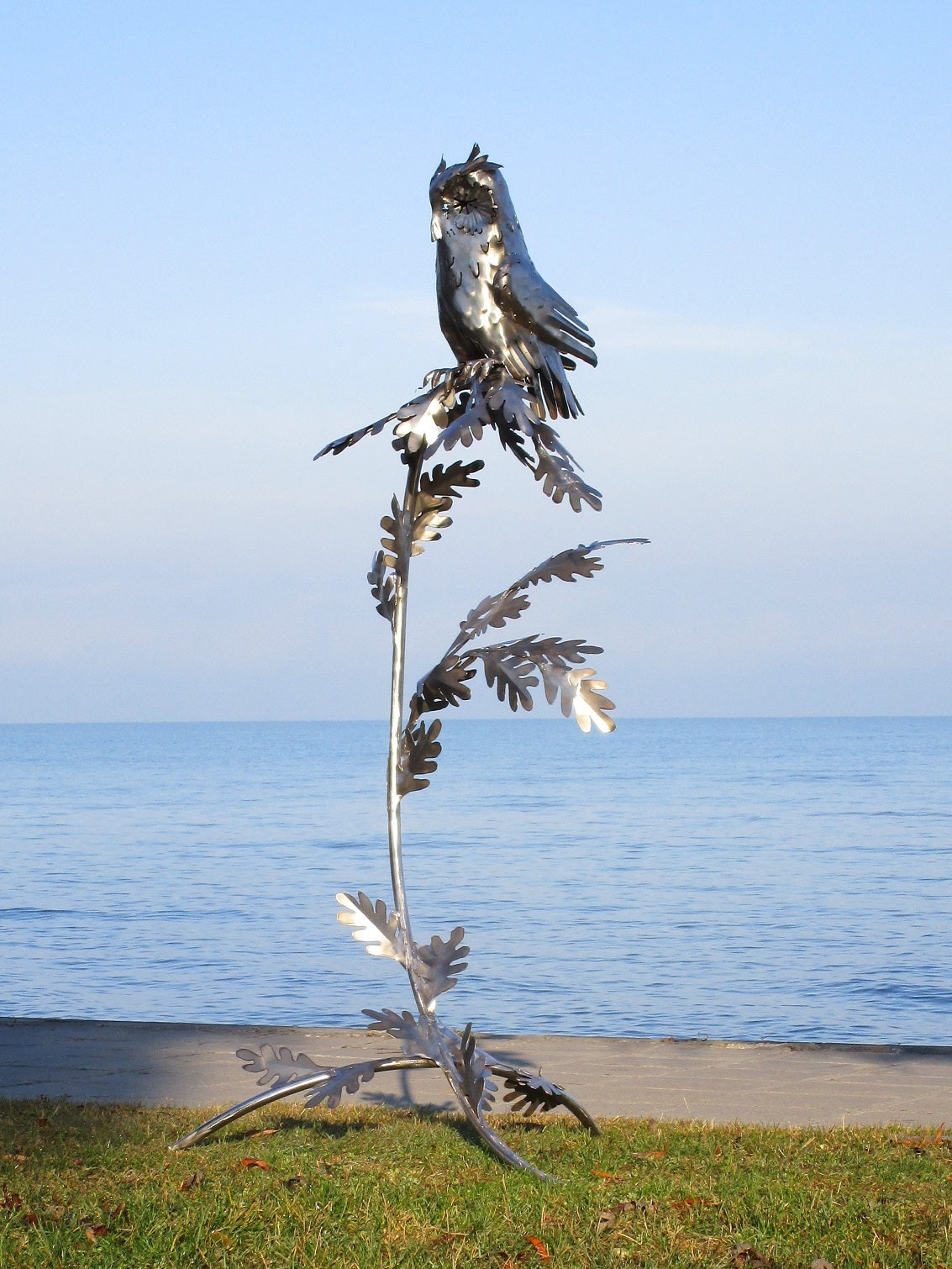 Der Ast, auf dem die Eule sitzt, besteht aus einem geschwungenen, schlanken Metallstab, der sich nach oben windet. An diesem Ast sind zahlreiche Blätter in verschiedenen Größen befestigt, die aus Metall gefertigt sind und detailliert die Form von Eichenblättern nachahmen. Die Blätter sind symmetrisch entlang des Astes verteilt und verleihen der Skulptur eine organische, natürliche Anmutung.