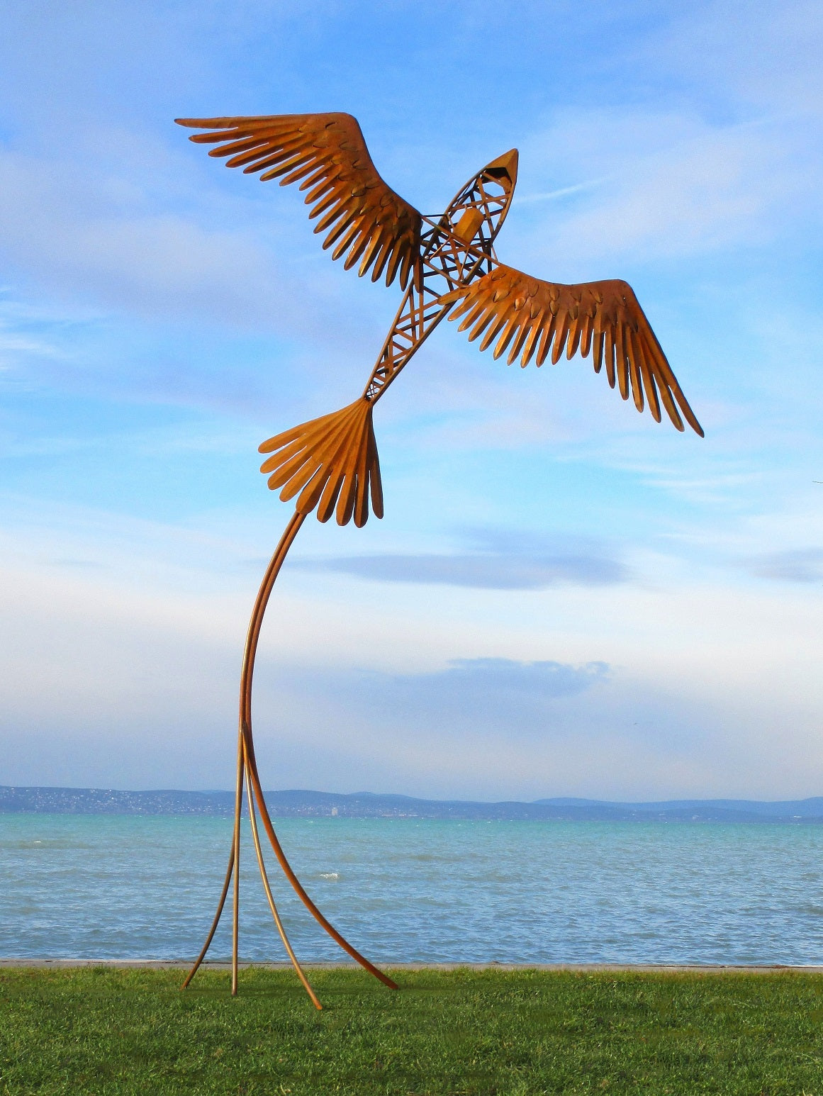 Der Vogel wird von geschwungenen, langgezogenen Metallstreben getragen, die sich elegant aus dem Boden erheben. Diese Streben verstärken die Illusion von Leichtigkeit und Aufstieg, da sie wie ein natürlicher Flugpfad wirken. Das Material der Skulptur weist eine warme, rostfarbene Patina auf, die dem Vogel einen organischen und zugleich industriellen Look verleiht. Insgesamt strahlt die Skulptur Anmut, Bewegung und Freiheit aus.