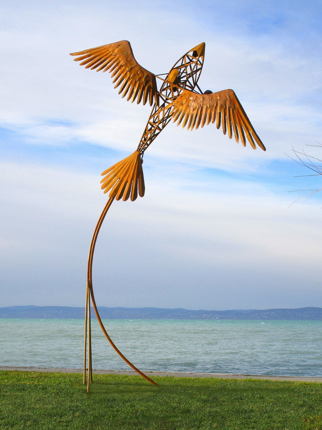 Die Skulptur stellt einen stilisierten Vogel dar, der in die Höhe zu fliegen scheint. Sie besteht aus einem filigranen, offenen Metallgerüst, das den Körper und die Struktur des Vogels formt. Die Flügel sind groß und aus langen, gefächerten Elementen geformt, die an natürliche Federn erinnern. Diese Federteile sind nach außen gerichtet und verleihen dem Kunstwerk eine dynamische und schwebende Wirkung.