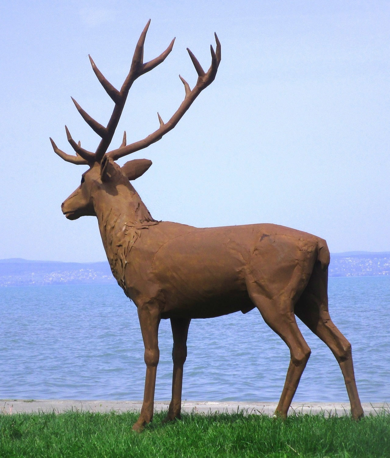 Die warme Rostfarbe des Metalls fügt sich harmonisch in die natürliche Umgebung ein, während die ruhige Haltung des Hirsches ein Gefühl von Anmut und Würde vermittelt. Diese Darstellung betont die Verbindung