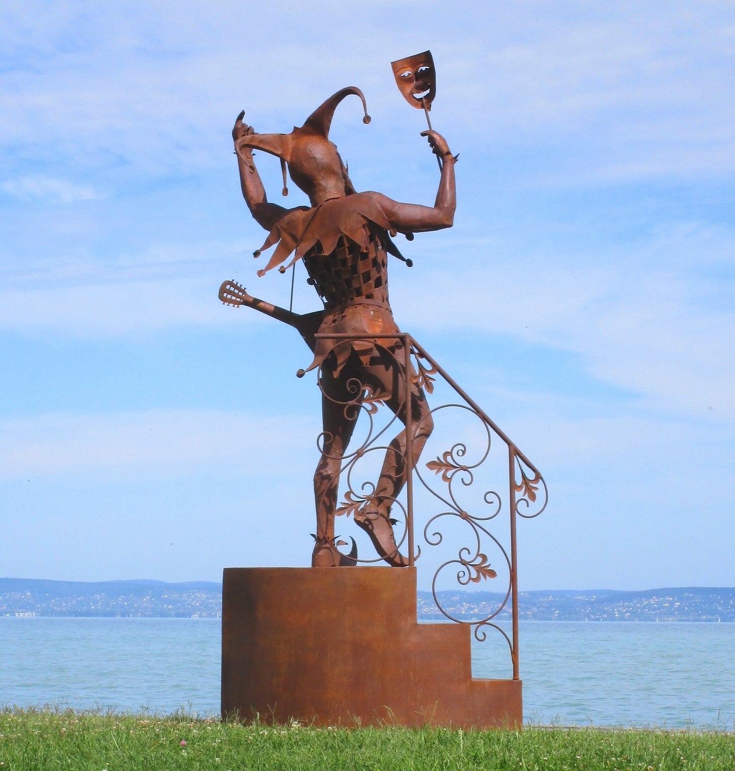 Die Skulptur zeigt einen Hofnarren, kunstvoll aus rostfarbenem Metall gefertigt. Der Narr steht in dynamischer Pose auf einer Treppe mit verzierten Geländern. Er hebt eine Maske in die Höhe, als symbolische Darstellung von Komik und Theater, während eine Laute an seiner Seite befestigt ist. Der Narrenhut mit gebogenen Spitzen und kleinen Kugeln verleiht der Figur Verspieltheit und Bewegung. Die Kleidung besteht aus einem rautenförmigen Muster, das sich durch den gesamten Körper zieht. Die Treppe und das Geländer sind mit floralen, kunstvollen Verzierungen versehen, was der Skulptur Eleganz und Struktur verleiht.