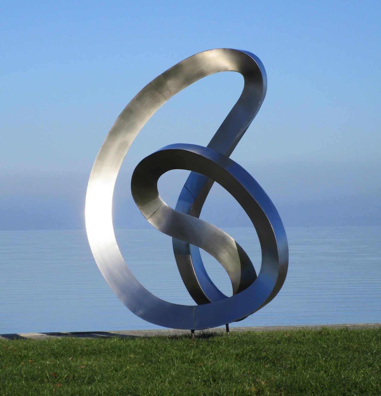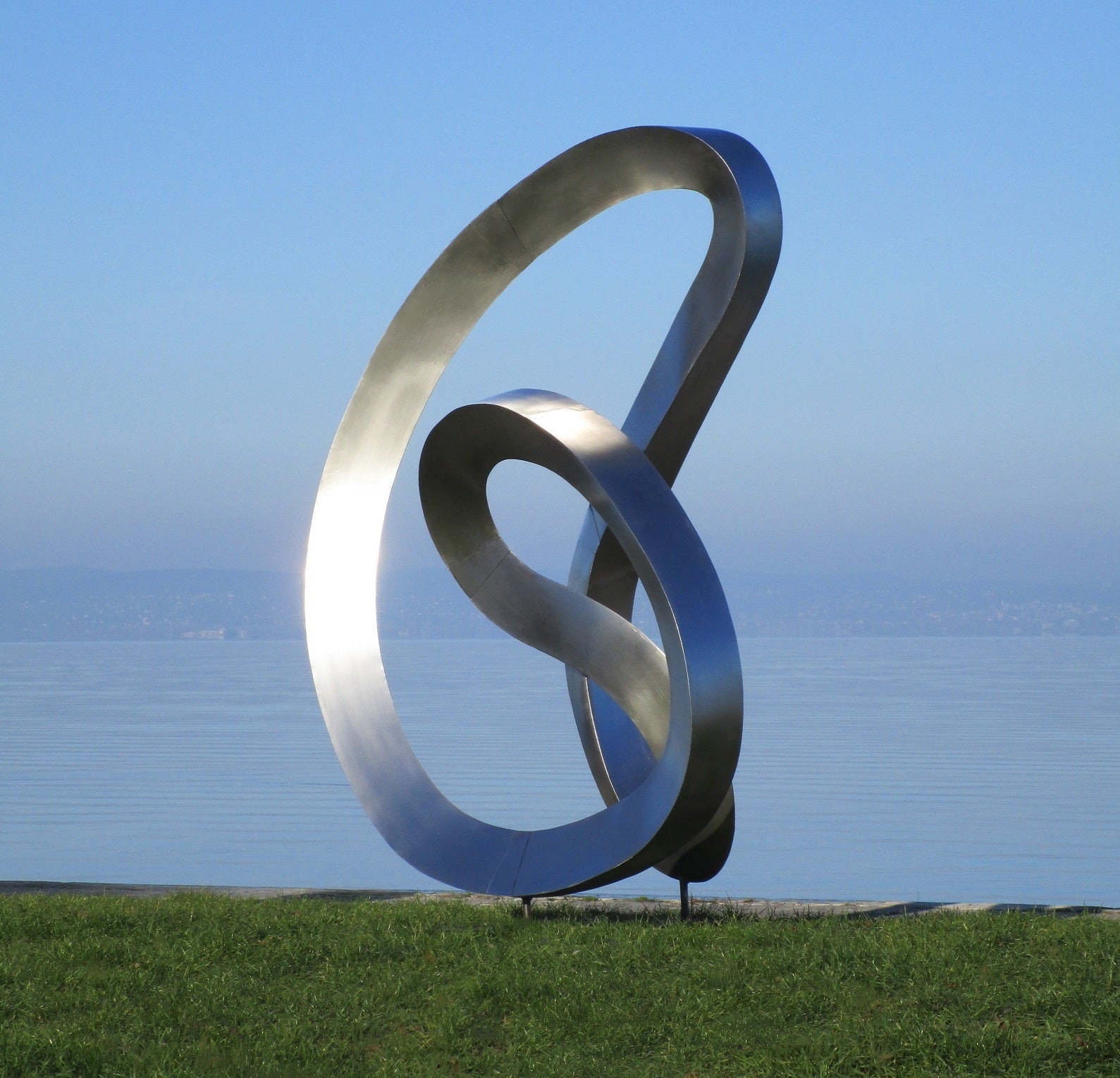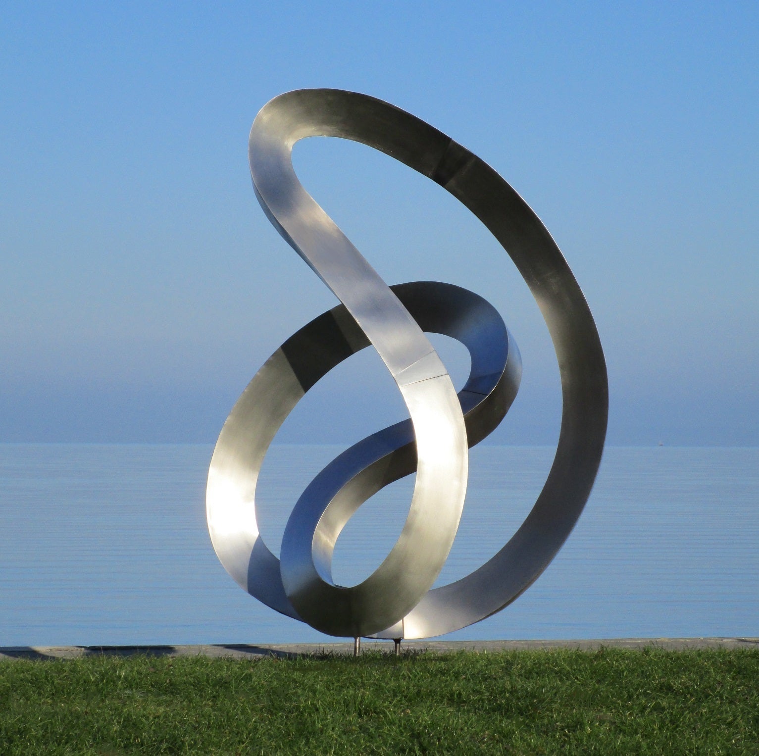 Die Skulptur besteht aus zwei geschwungenen, ineinander verschlungenen Ringen aus glänzendem Metall. Ihre Oberfläche ist glatt und poliert, wodurch sie das Licht reflektiert und eine moderne, elegante Ausstrahlung erhält. Die Ringe scheinen sich fließend zu durchdringen und erzeugen eine dynamische, fast schwebende Form, die Bewegung und Balance zugleich symbolisiert. Durch ihre geschwungene Struktur wirkt die Skulptur sowohl stabil als auch leicht, was ihr eine abstrakte und zeitlose Ästhetik verleiht.