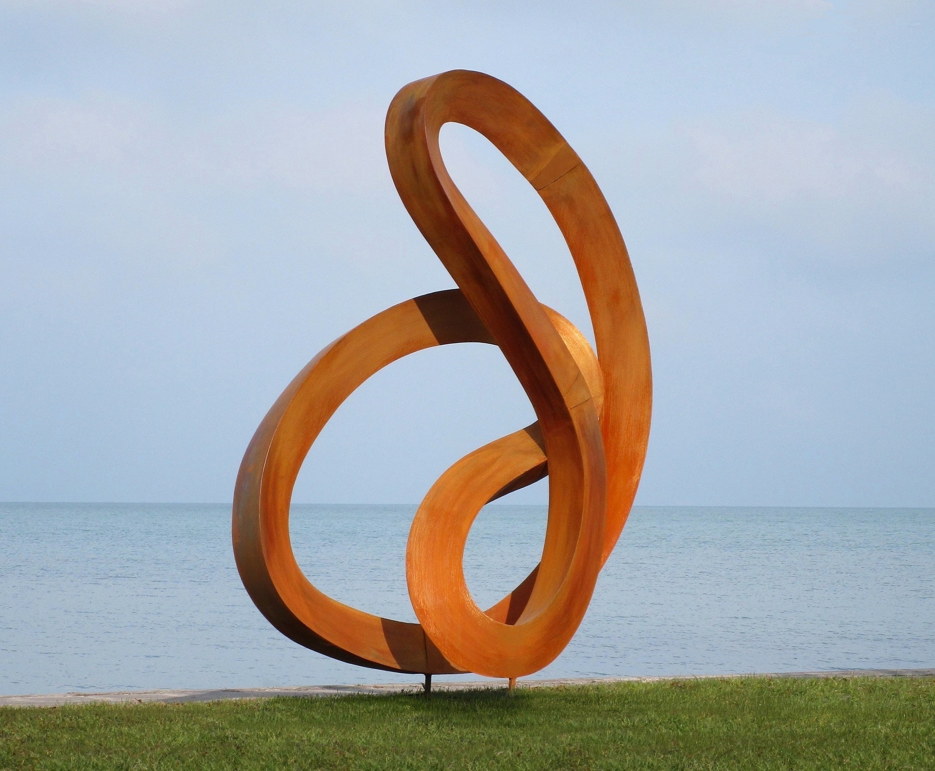 Die Skulptur besteht aus zwei großen, ineinander verschlungenen Ringen aus rostfarbenem Metall. Die Ringe haben eine organische, geschwungene Form und scheinen sich elegant zu durchdringen, wodurch ein Gefühl von Bewegung und Balance entsteht. Ihre glatte Oberfläche und die harmonische Krümmung verleihen der Skulptur eine zeitlose, abstrakte Ästhetik. Sie ist fest im Boden verankert, wodurch sie trotz ihrer dynamischen Erscheinung stabil wirkt. Die Skulptur strahlt Minimalismus und Modernität aus und steht im Kontrast zur natürlichen Umgebung.
