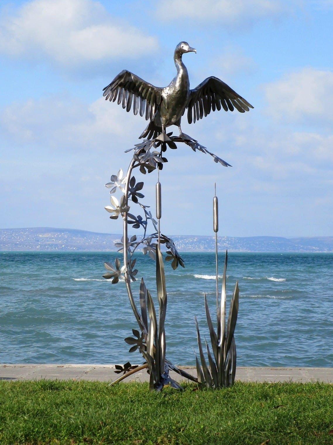 Insgesamt kombiniert die Skulptur den Kormoran als Hauptmotiv mit einer natürlichen Umgebung, die durch Metallpflanzen und Schilf dargestellt wird. Die glänzende Oberfläche des Vogels hebt ihn hervor, während die schlichteren Elemente der Pflanzenstruktur die Szenerie harmonisch abrunden.