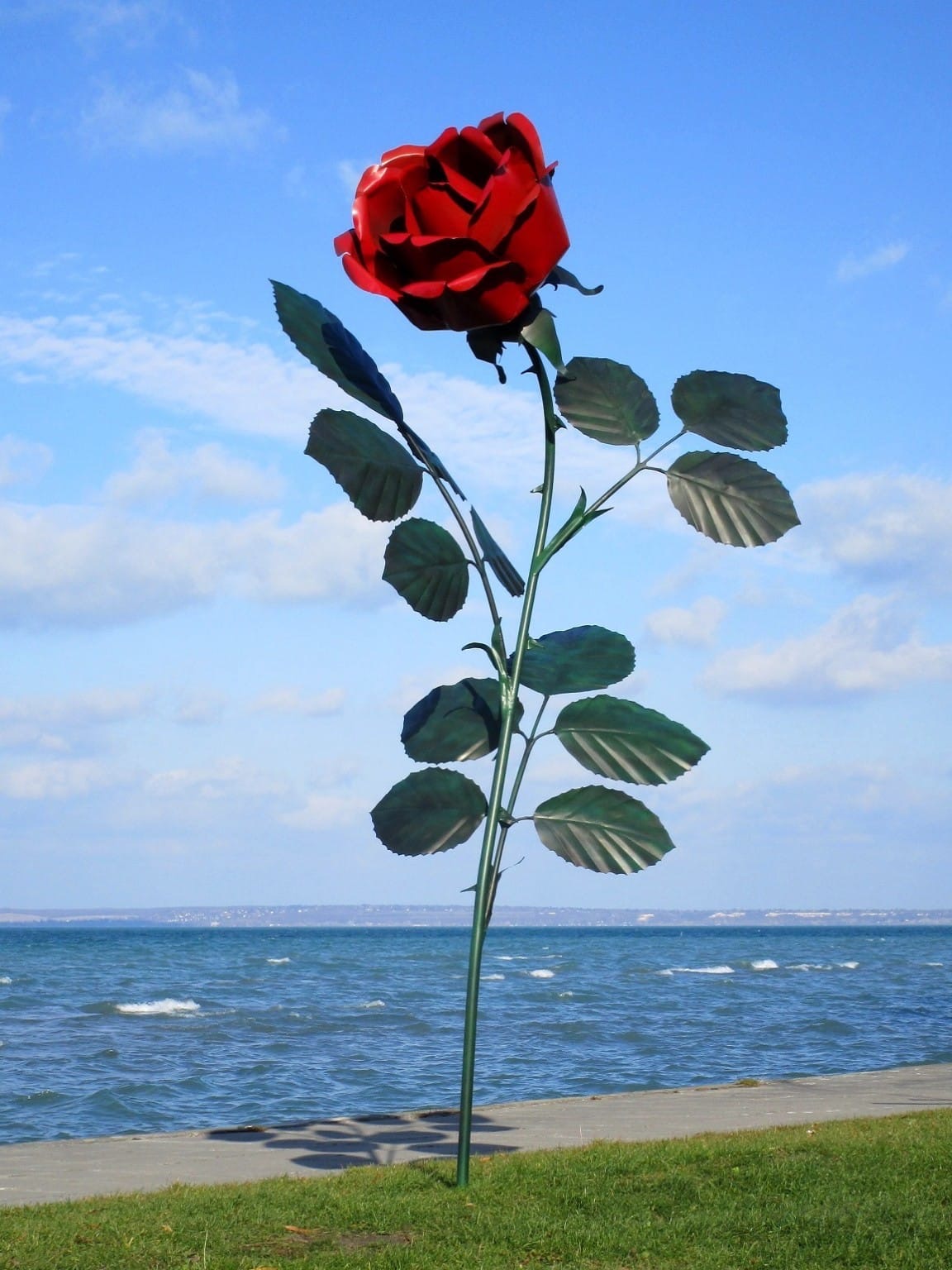 Die kräftige Farbgebung der Rose setzt einen eindrucksvollen Kontrast zur natürlichen Umgebung von Himmel und Wasser. Die monumentale Größe betont die Symbolik der Rose als Zeichen für Liebe, Schönheit und Vergänglichkeit, während die handwerkliche Präzision die Skulptur zu einem harmonischen und zugleich auffälligen Kunstwerk in der Landschaft macht.