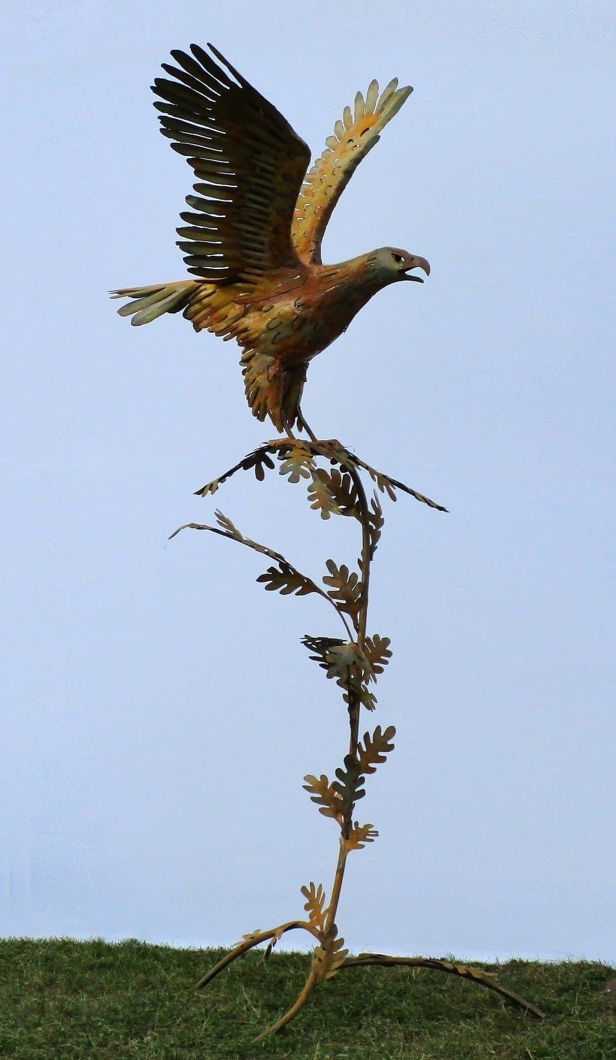 Die Figur ruht auf einer geschwungenen, filigran gestalteten Basis aus metallischen Eichenblättern und -zweigen. Diese Pflanzenstruktur verleiht der Skulptur eine natürliche Verbindung zur Erde und schafft einen harmonischen Kontrast zur imposanten Gestalt des Adlers. Die rostfarbenen Töne des Materials verstärken den organischen Charakter, während die Höhe und Eleganz der Skulptur den Blick in die Weite lenken.