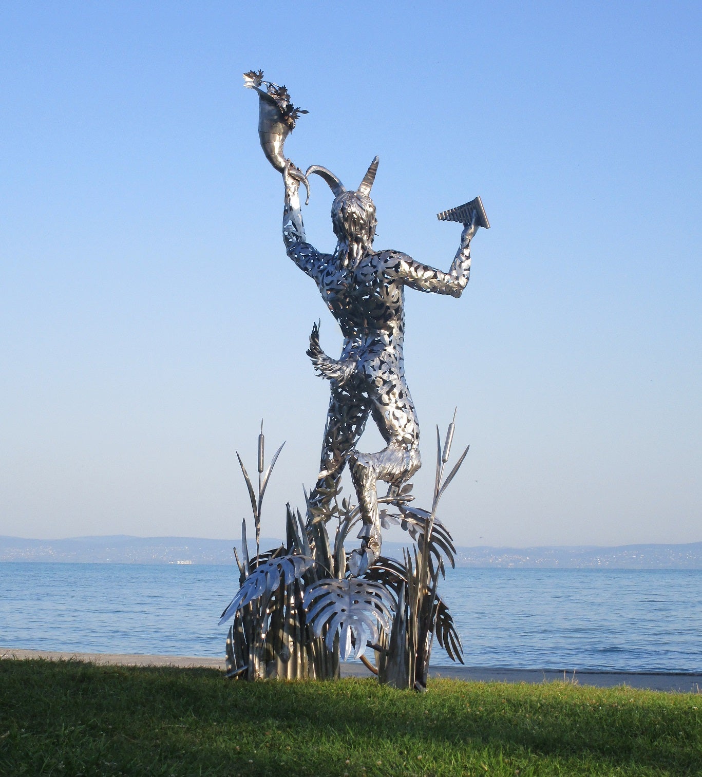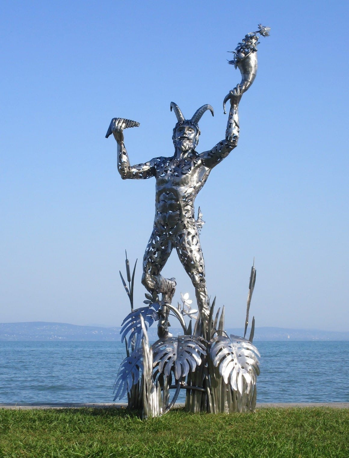 Die Skulptur zeigt eine mythologische Gestalt, einen gehörnten Faun oder Satyr, gefertigt aus poliertem Metall. Die muskulöse Figur steht kraftvoll auf einem dekorativen Sockel aus großen Blättern und Pflanzenmotiven. Der Faun hält in der linken Hand ein Füllhorn, das mit Blüten und Pflanzen verziert ist, während die rechte Hand einen kleinen Gegenstand (möglicherweise ein Instrument oder ein Horn) präsentiert. Die Oberfläche besteht aus vielen filigranen, durchbrochenen Elementen, die eine kunstvolle Textur schaffen und Licht reflektieren. Die gesamte Darstellung wirkt dynamisch und feierlich, symbolisiert Fruchtbarkeit, Naturverbundenheit und Lebensfreude.