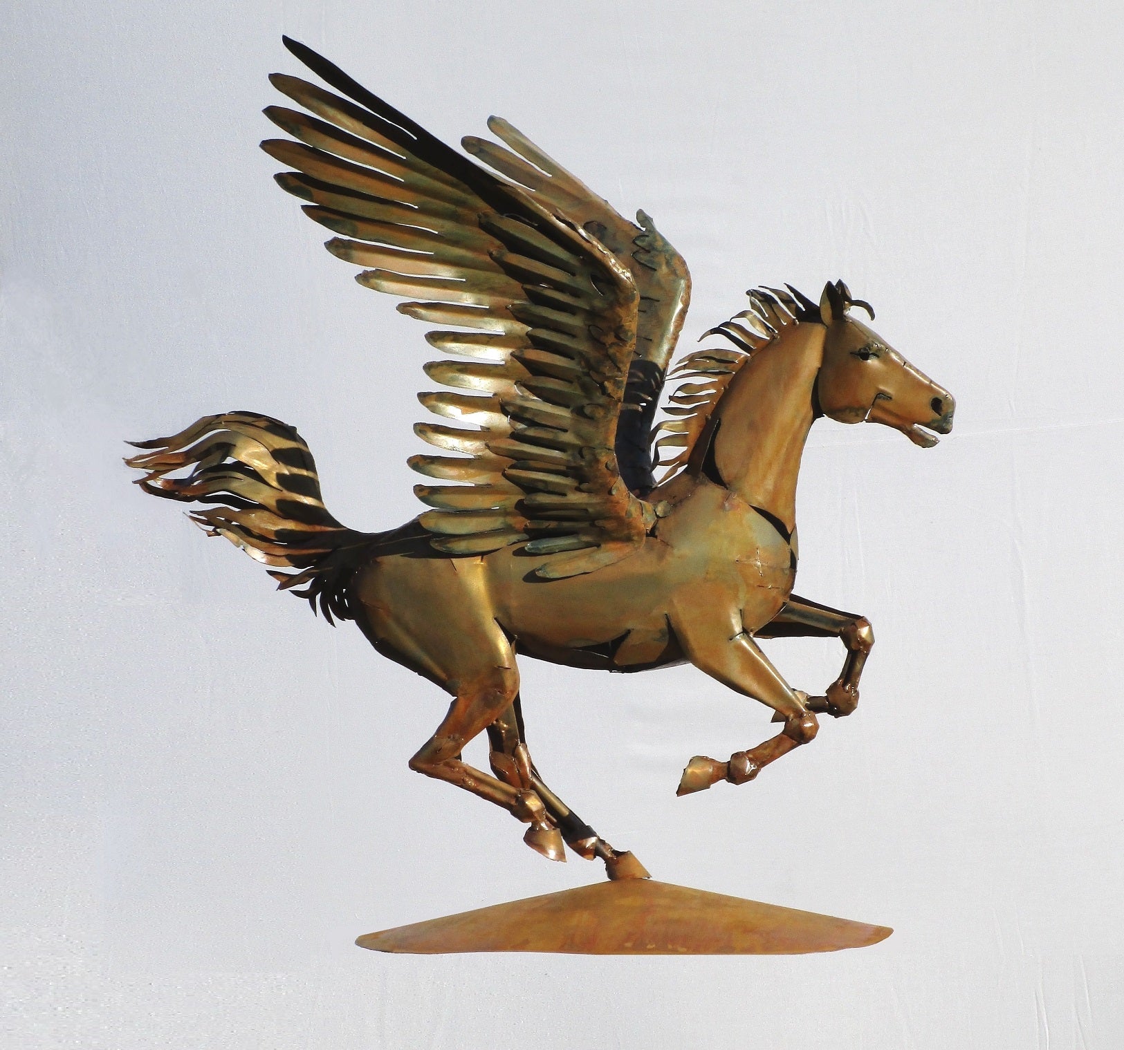 Die Skulptur zeigt ein geflügeltes Pferd, das mythologische Wesen Pegasus, in einer dynamischen Pose. Die metallene Darstellung beeindruckt durch kunstvoll ausgearbeitete Details, wie die weit ausgebreiteten, federreichen Flügel, die wehende Mähne und den fließenden Schweif. Das Pferd scheint in Bewegung zu sein, was durch die elegante Haltung der Beine und den Schwung des Körpers betont wird.