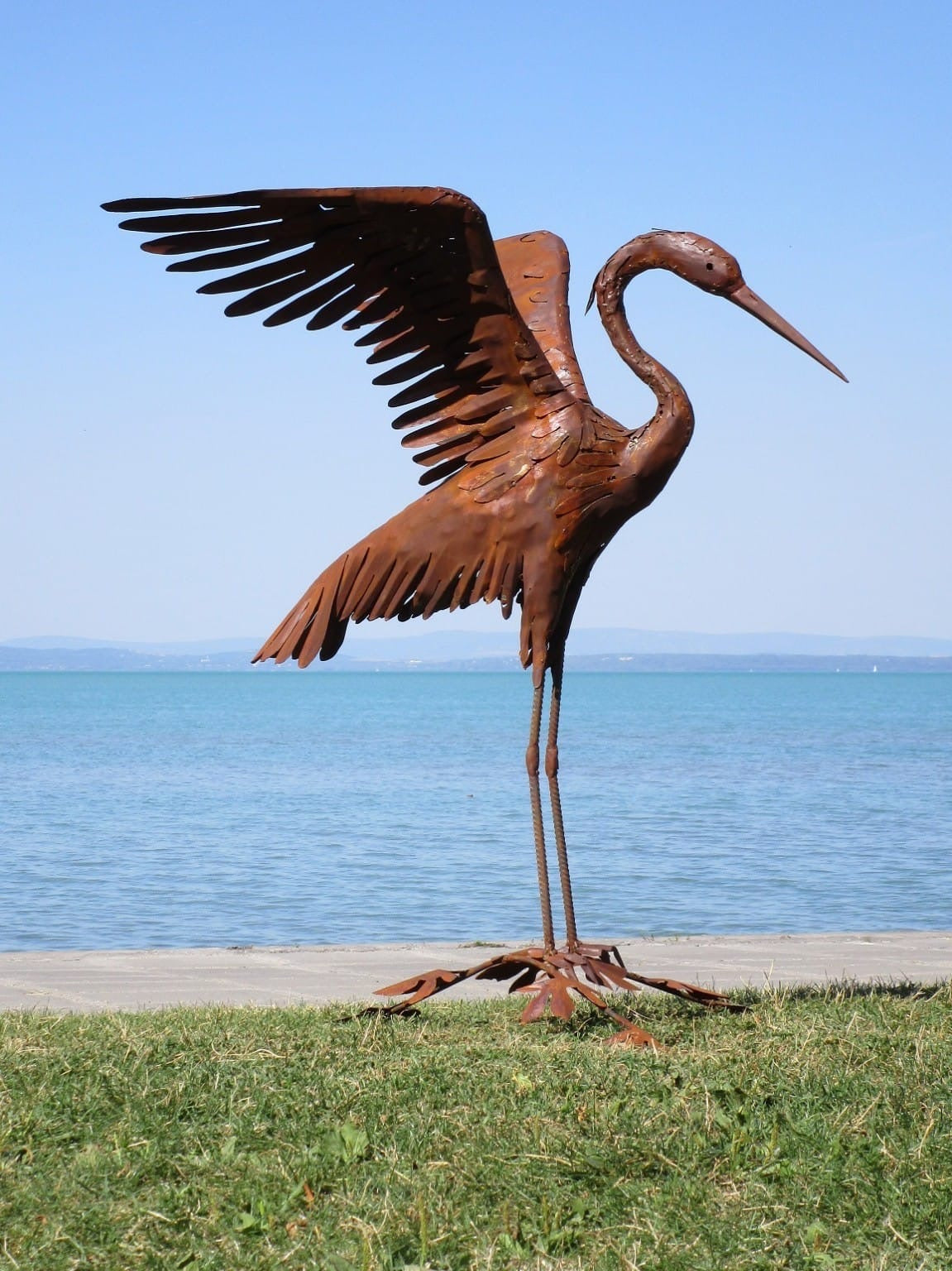Die Skulptur zeigt einen großen Reiher aus rostfarbenem Metall, der in einer dynamischen Pose dargestellt ist. Mit weit ausgebreiteten Flügeln und einem elegant nach vorne gestreckten Hals vermittelt die Figur das Gefühl von Bewegung und Leichtigkeit. Die filigranen Details der Flügel und der schlanke, lange Körper des Vogels betonen seine Anmut und natürliche Schönheit.