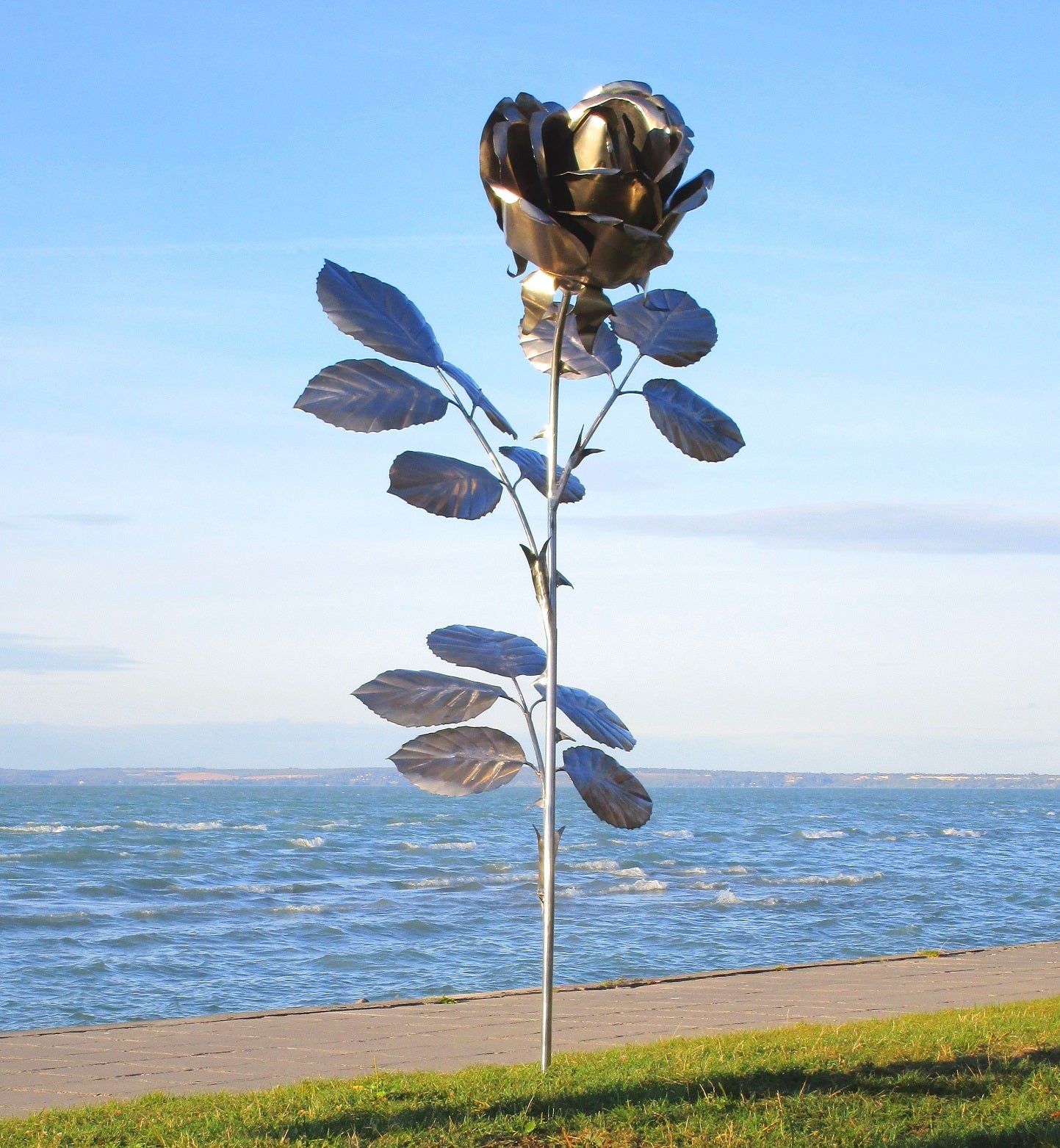 Die Skulptur stellt eine überdimensionale Rose dar, die aus poliertem Metall gefertigt ist. Die detailreich gestalteten Blätter und die elegant geformten Blütenblätter verleihen der Skulptur eine naturgetreue Anmutung, während die glänzende Oberfläche ein modernes, zeitloses Element hinzufügt. Der lange, schlanke Stiel unterstreicht die filigrane Erscheinung der Rose und erzeugt einen starken vertikalen Akzent. Die Lichtreflexionen auf dem Metall verstärken den Eindruck von Lebendigkeit und Dynamik. Die Skulptur symbolisiert mit ihrer klaren Form und dem glänzenden Material die Kombination aus natürlicher Schönheit und künstlerischer Präzision.