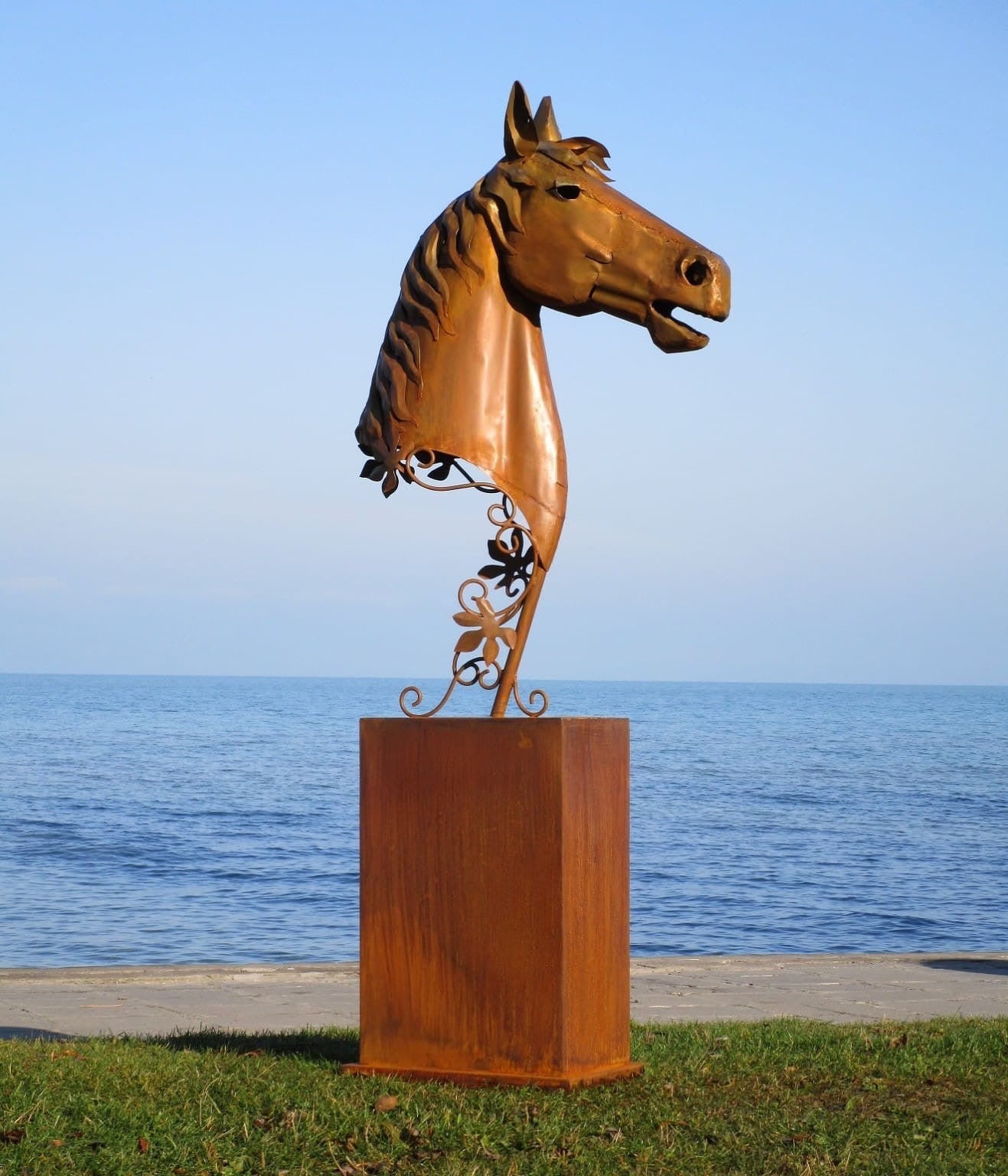 Die Skulptur zeigt einen Pferdekopf, kunstvoll aus Metall gefertigt und auf einem rechteckigen Sockel aus rostfarbigem Material montiert. Der Kopf ist detailreich gestaltet, mit feinen Linien, die die Mähne und Gesichtszüge hervorheben. Der Hals verläuft elegant nach unten und wird durch florale Ornamente und geschwungene Linien durchbrochen, was der Struktur Leichtigkeit und Dynamik verleiht. Die Oberfläche der Skulptur wirkt bewusst gealtert und rostig, was ihr eine warme, erdige Ausstrahlung verleiht. Die gesamte Komposition vereint Stärke und Ästhetik und wirkt sowohl modern als auch zeitlos.