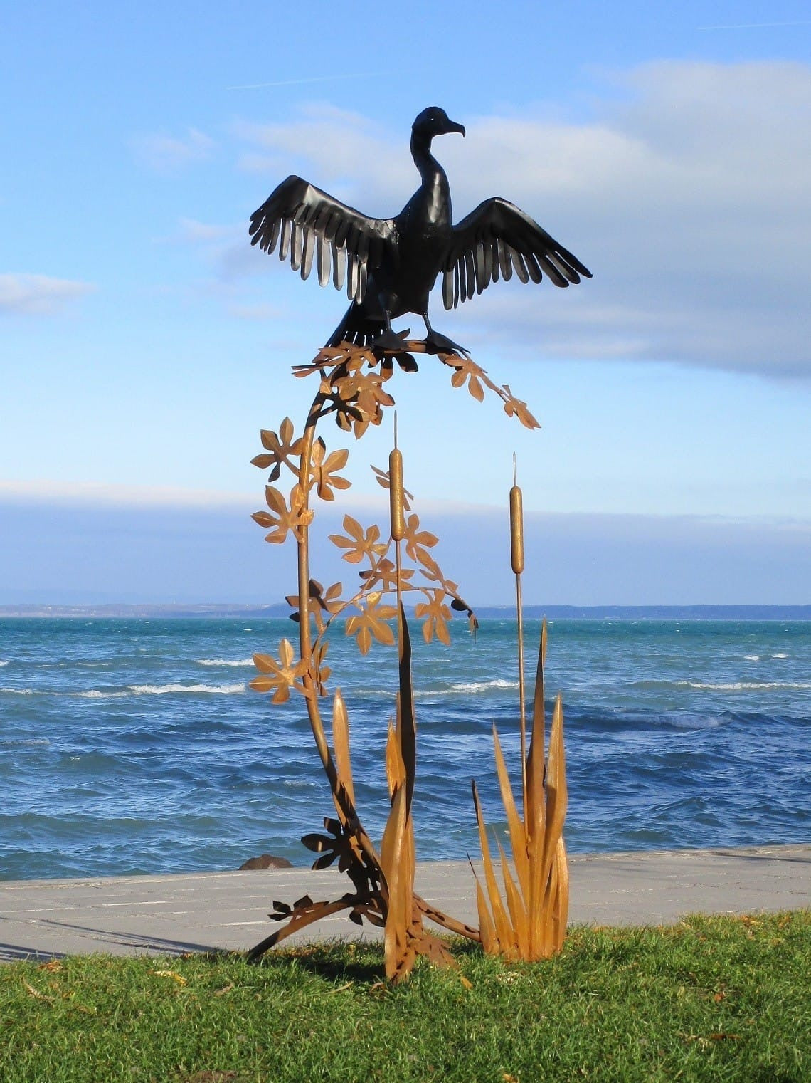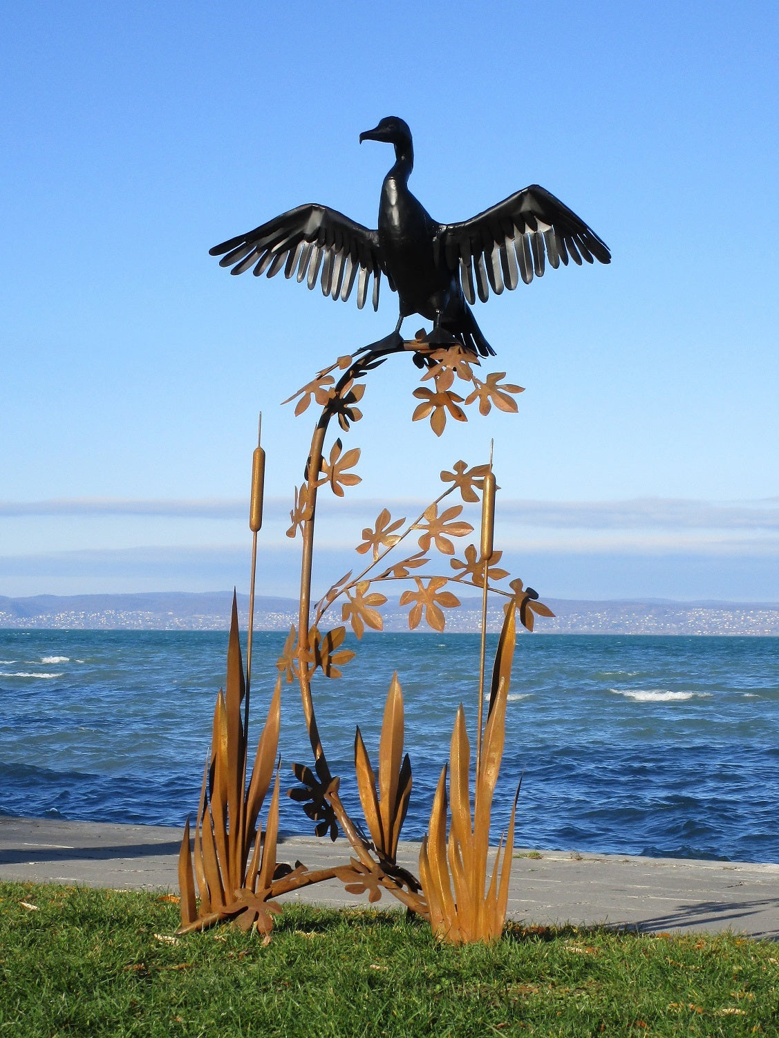 Die Skulptur zeigt einen Kormoran, der mit ausgebreiteten Flügeln auf einem Ast sitzt, als würde er gerade seine Flügel trocknen. Der Vogel ist aus schwarzem Metall gefertigt, was ihm ein realistisches und zugleich künstlerisches Aussehen verleiht.