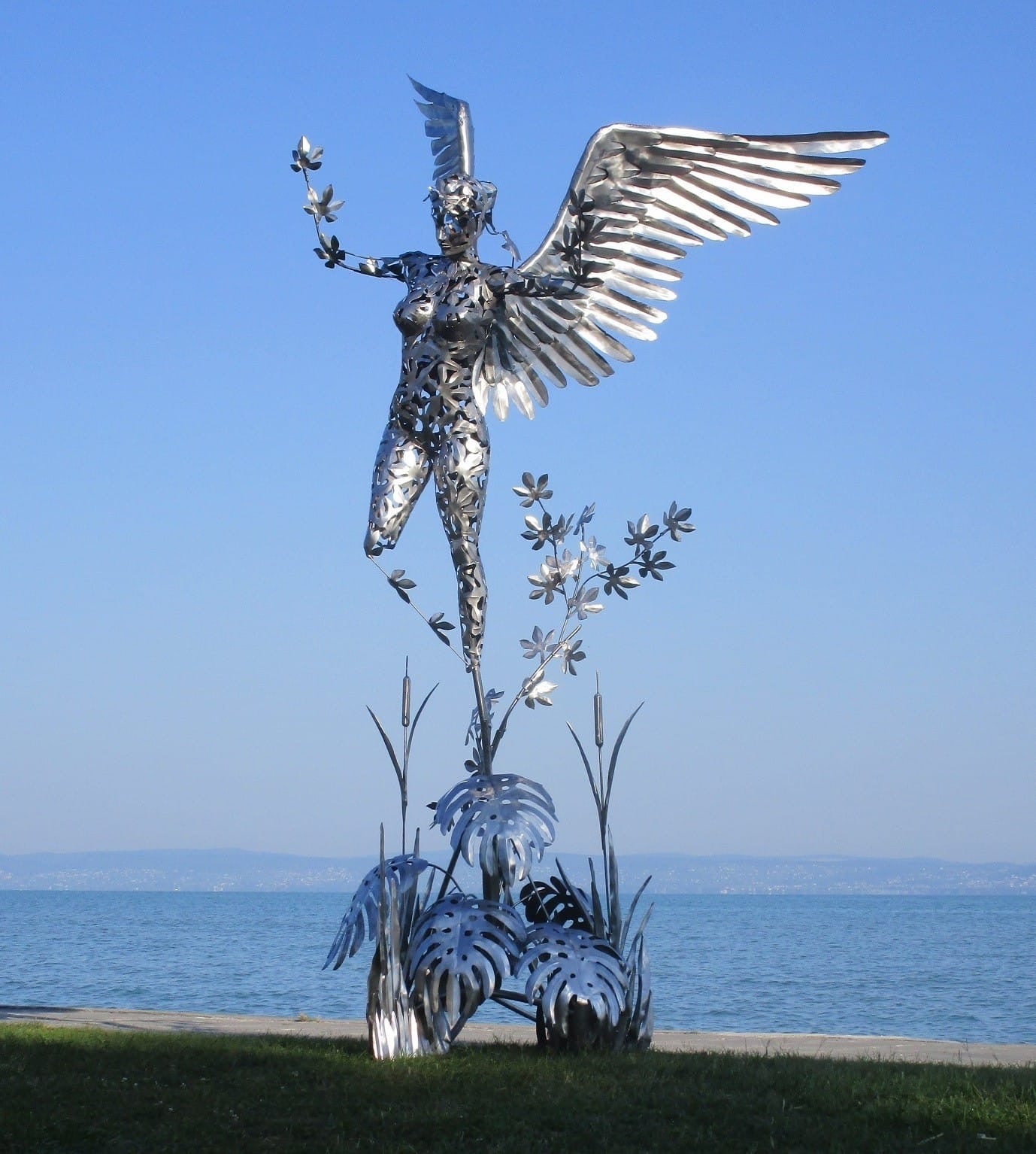 Die Skulptur zeigt eine geflügelte weibliche Gestalt aus glänzendem Metall, die anmutig und kraftvoll in die Höhe ragt. Die großen, weit ausgebreiteten Flügel sind detailreich gestaltet und vermitteln ein Gefühl von Leichtigkeit und Freiheit. Die Figur, die in der Luft schwebt, ist von kunstvoll gearbeiteten Pflanzen- und Blumenmotiven umgeben, die der Komposition eine natürliche Harmonie verleihen.