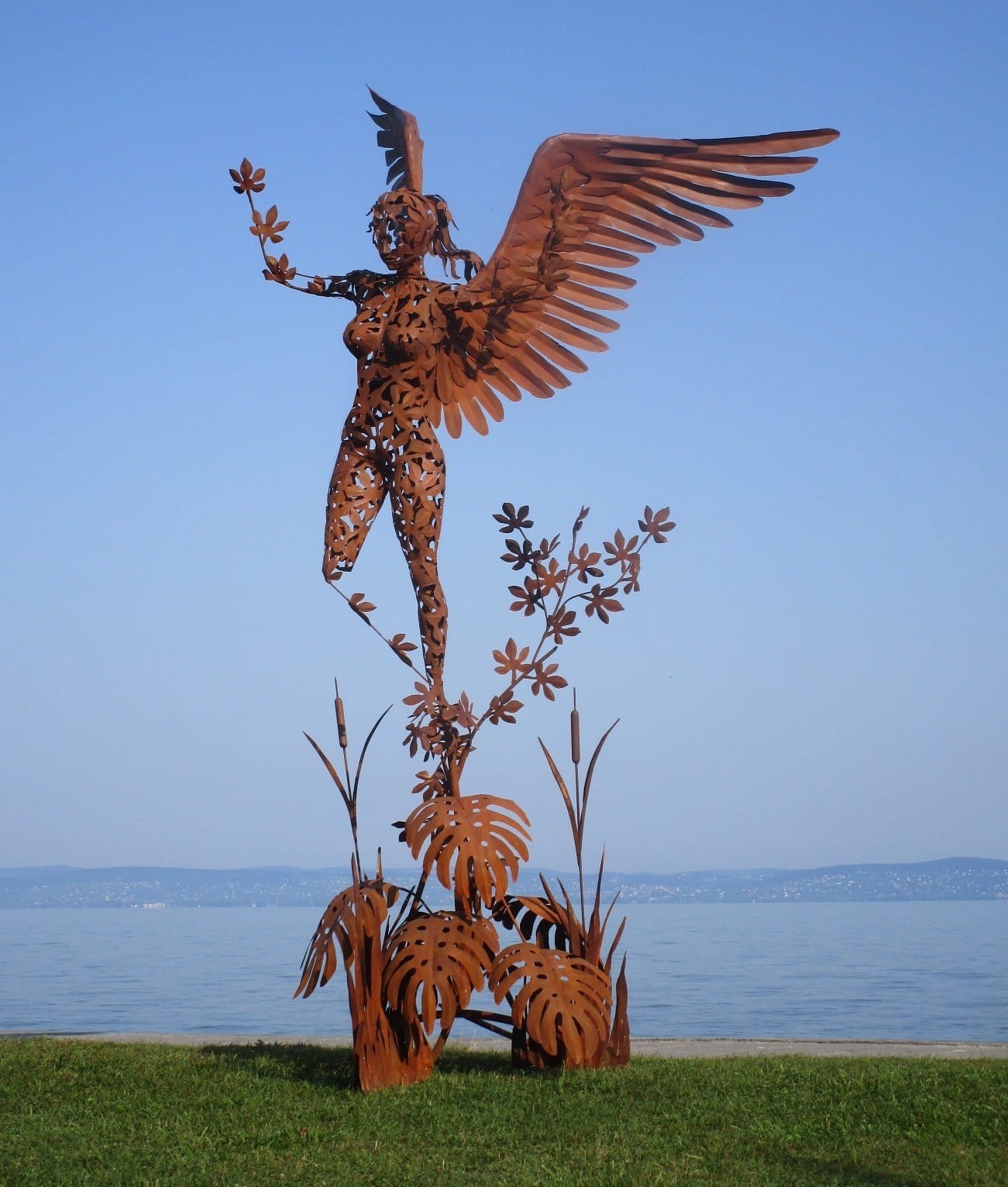 Die Skulptur zeigt eine geflügelte weibliche Figur aus rostfarbenem Metall, die in einer dynamischen Pose dargestellt ist. Ihre weit ausgebreiteten Flügel und die filigrane Gestaltung des Körpers vermitteln Leichtigkeit und Anmut. Die Figur scheint zu schweben und hält eine Blume in der Hand, während um sie herum kunstvoll gearbeitete Pflanzen- und Blättermotive die Verbindung zur Natur unterstreichen.