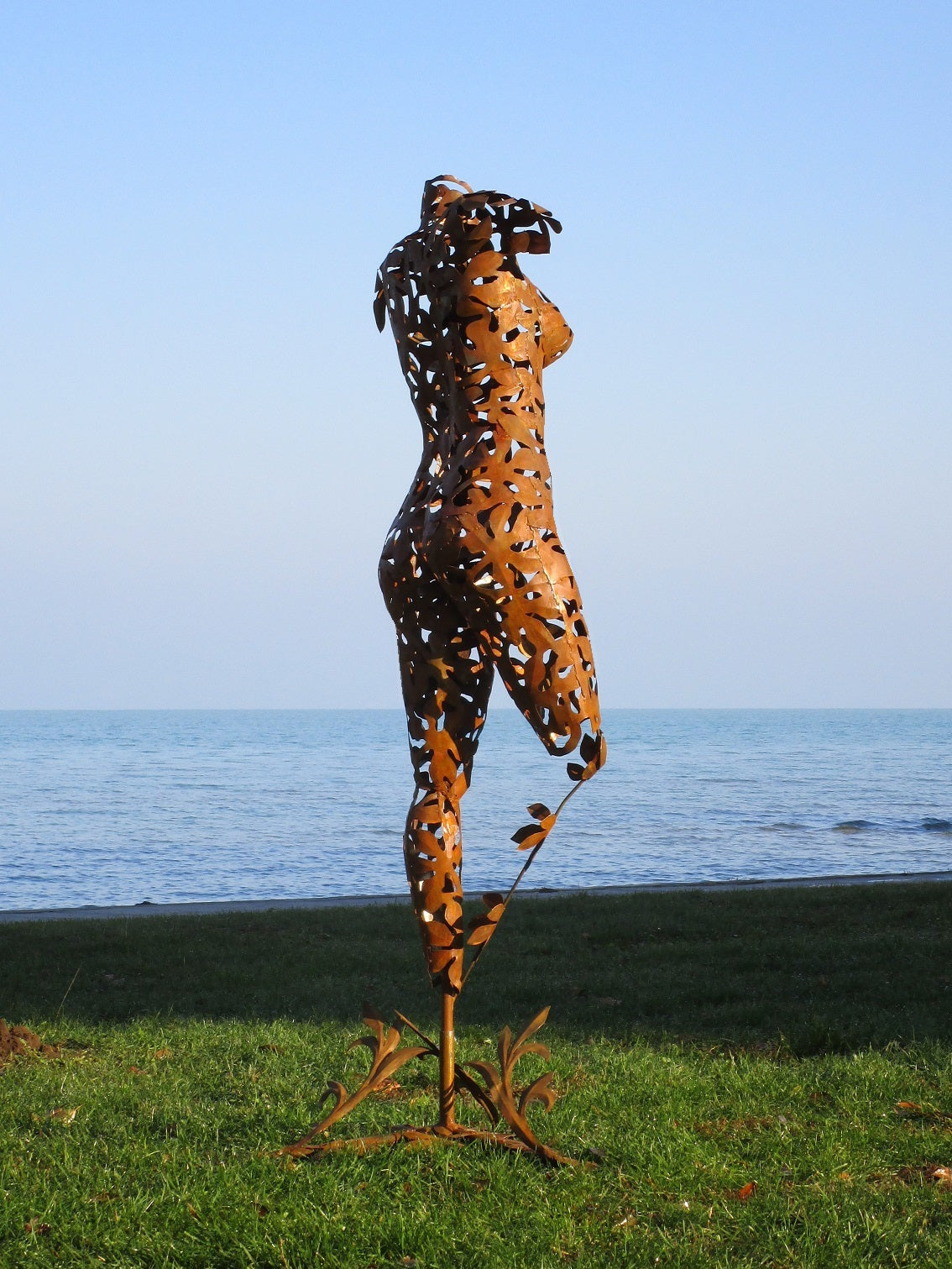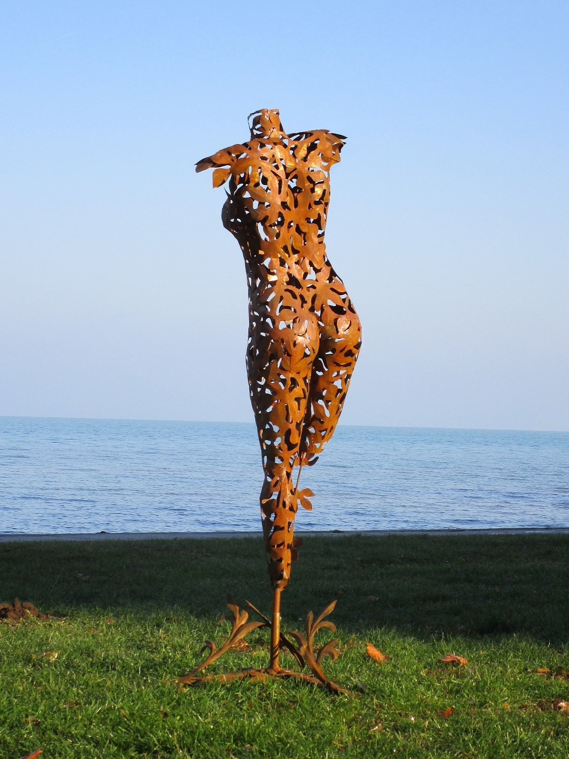 Die Skulptur zeigt einen filigranen, aus rostfarbenem Metall gefertigten weiblichen Torso. Sie besteht aus kunstvoll durchbrochenen, floralen Mustern, die der Figur eine luftige und zugleich organische Wirkung verleihen. Der Torso ist elegant geformt und stellt die feminine Silhouette in einer natürlichen Pose dar, ohne Arme und Kopf.