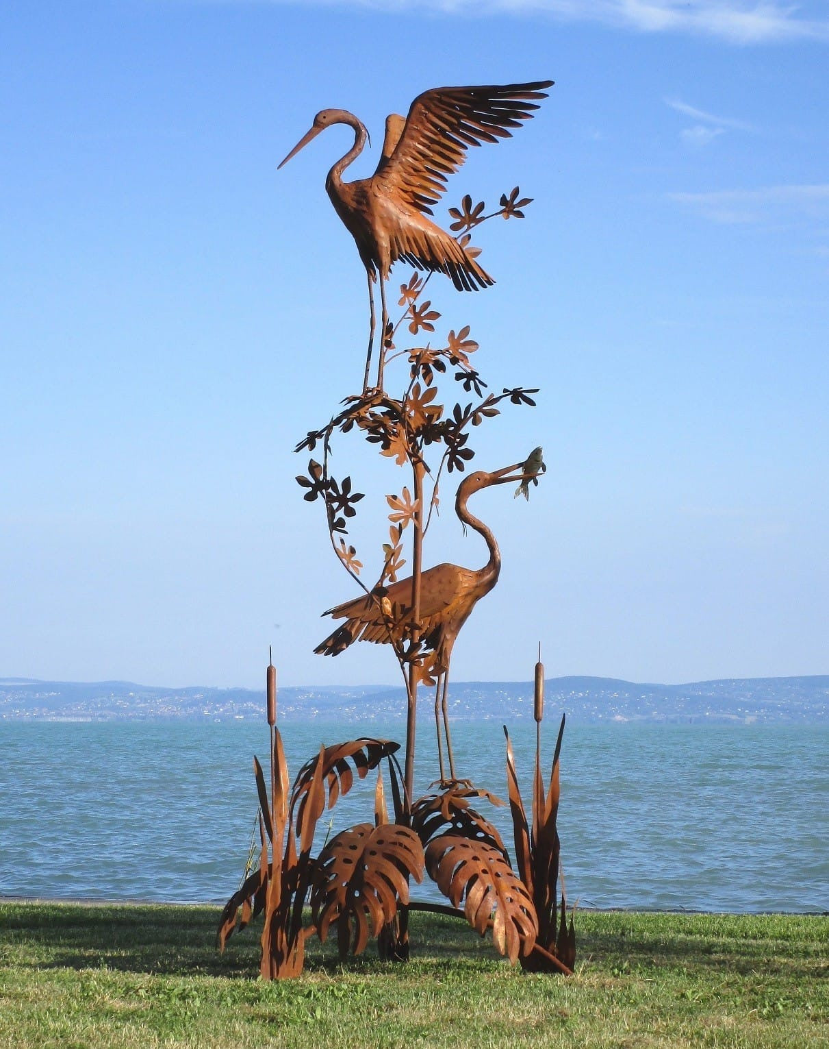 Die Skulptur zeigt zwei elegant gestaltete Reiher aus rostfarbenem Metall in einer natürlichen Szene. Einer der Reiher steht mit ausgebreiteten Flügeln in einer dynamischen Pose auf einer erhöhten Position, während der andere Reiher ruhiger wirkt und einen kleinen Fisch im Schnabel hält. Die filigran gearbeiteten Vögel sind von dekorativen, blattähnlichen Elementen und Schilfpflanzen umgeben, die der Komposition eine harmonische Verbindung zur Natur verleihen.